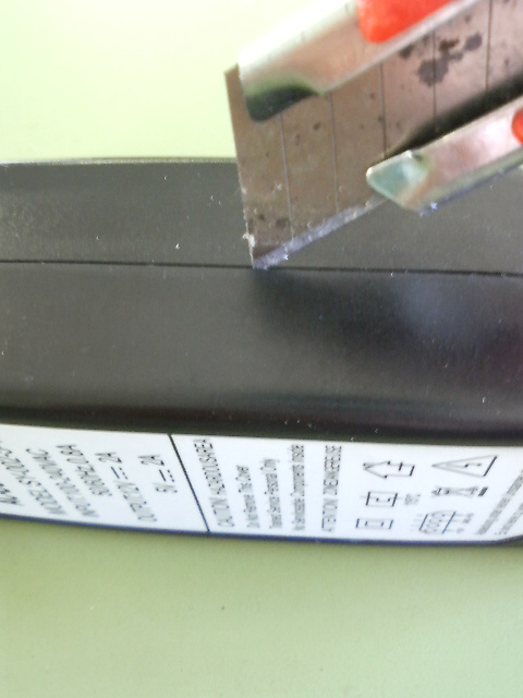 アダプタの開封は、横の溝についている、接着剤部分にカッターナイフをあてて、剥離する作業から開始します。本来、分解すべきものではないような設計なのですが。